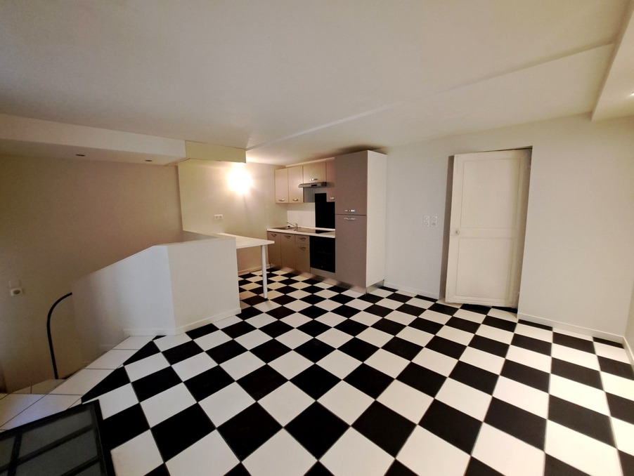 Cet appartement se compose au rez-de-chaussée d'une salle à manger avec une cuisine ouverte aménagée et équipée (hotte, plaques, four et frigo/congélateur), d'une chambre avec salle d'eau et wc, et en souplex d'un séjour voûté en pierre, d'un espace nuit ou bureau et une seconde salle d'eau avec wc.
