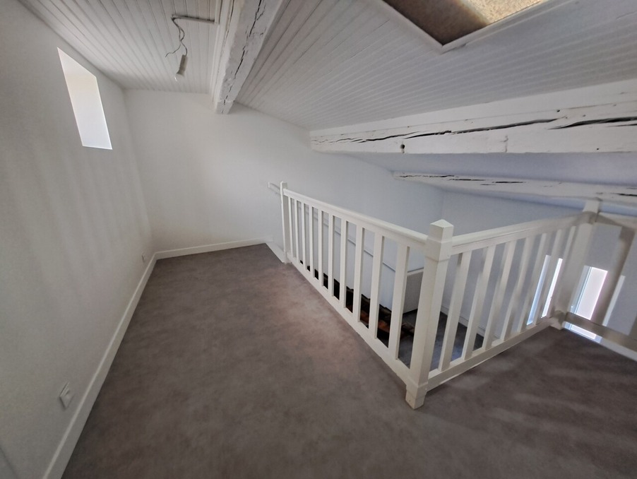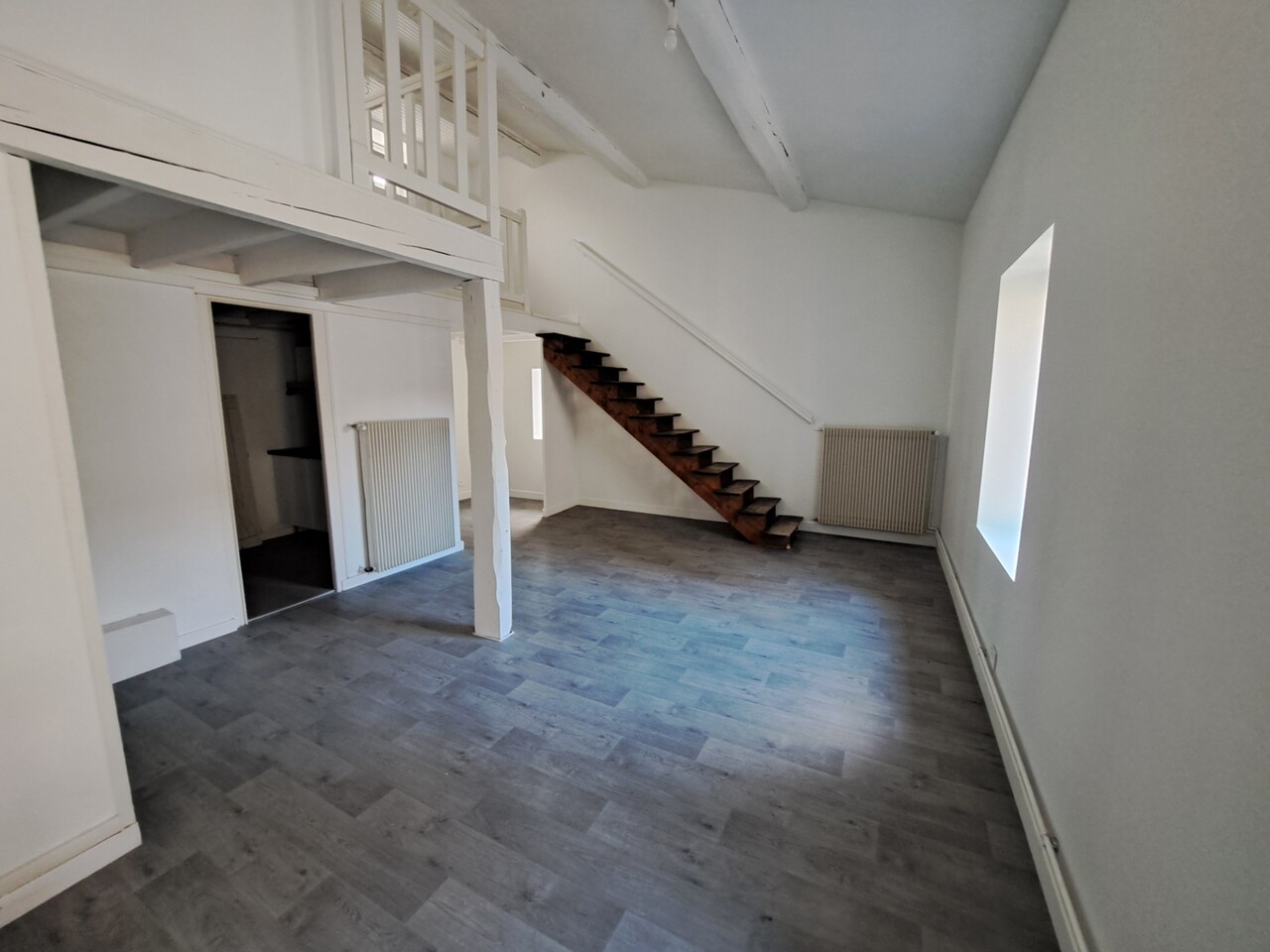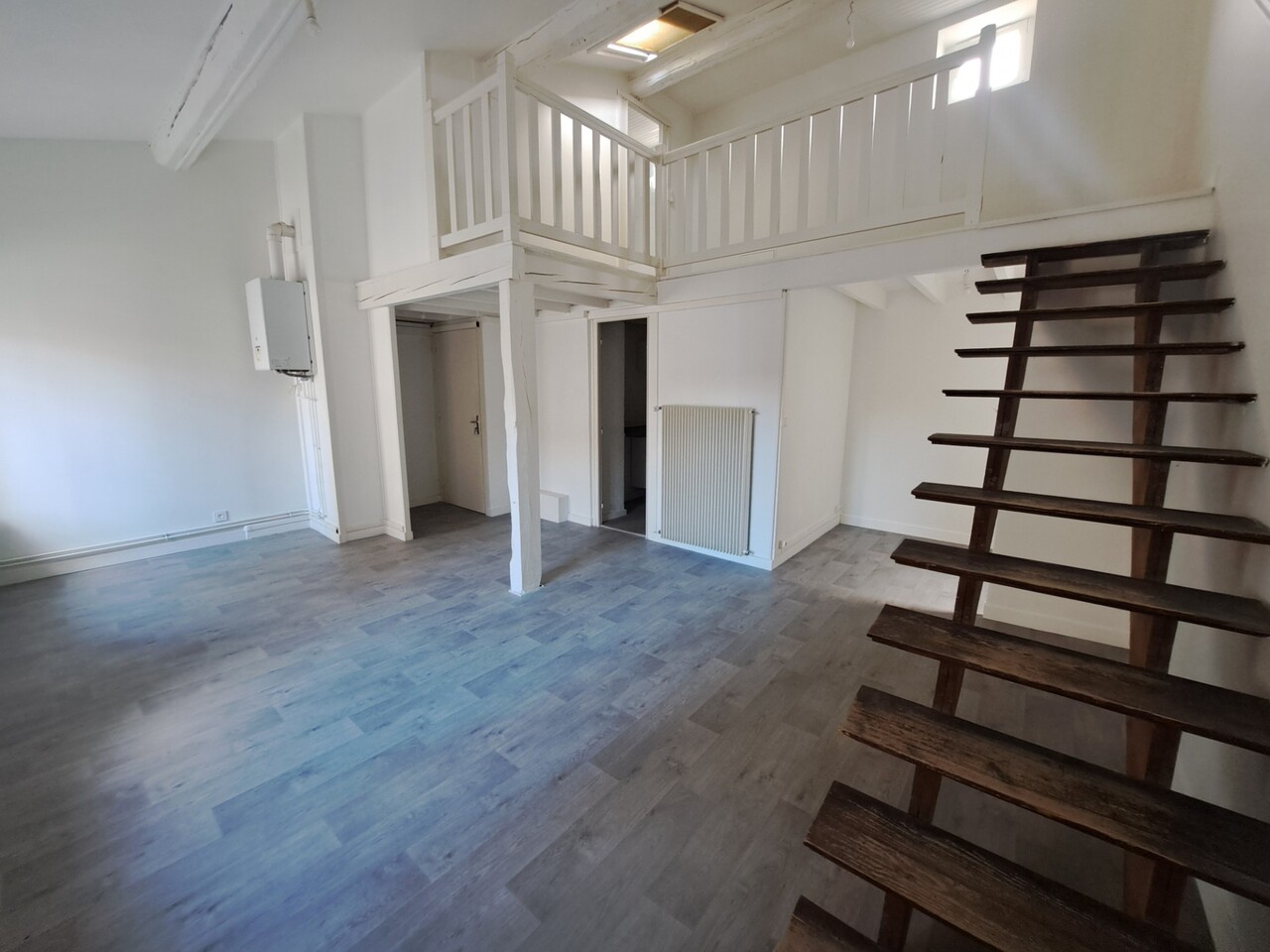 Cet appartement se compose d'une grande pièce de vie lumineuse, d'une cuisine neuve aménagée (meubles et plaques), d'un coin bureau, d'un espace nuit en mezzanine et d'une salle de bains avec wc et branchement machine à laver.