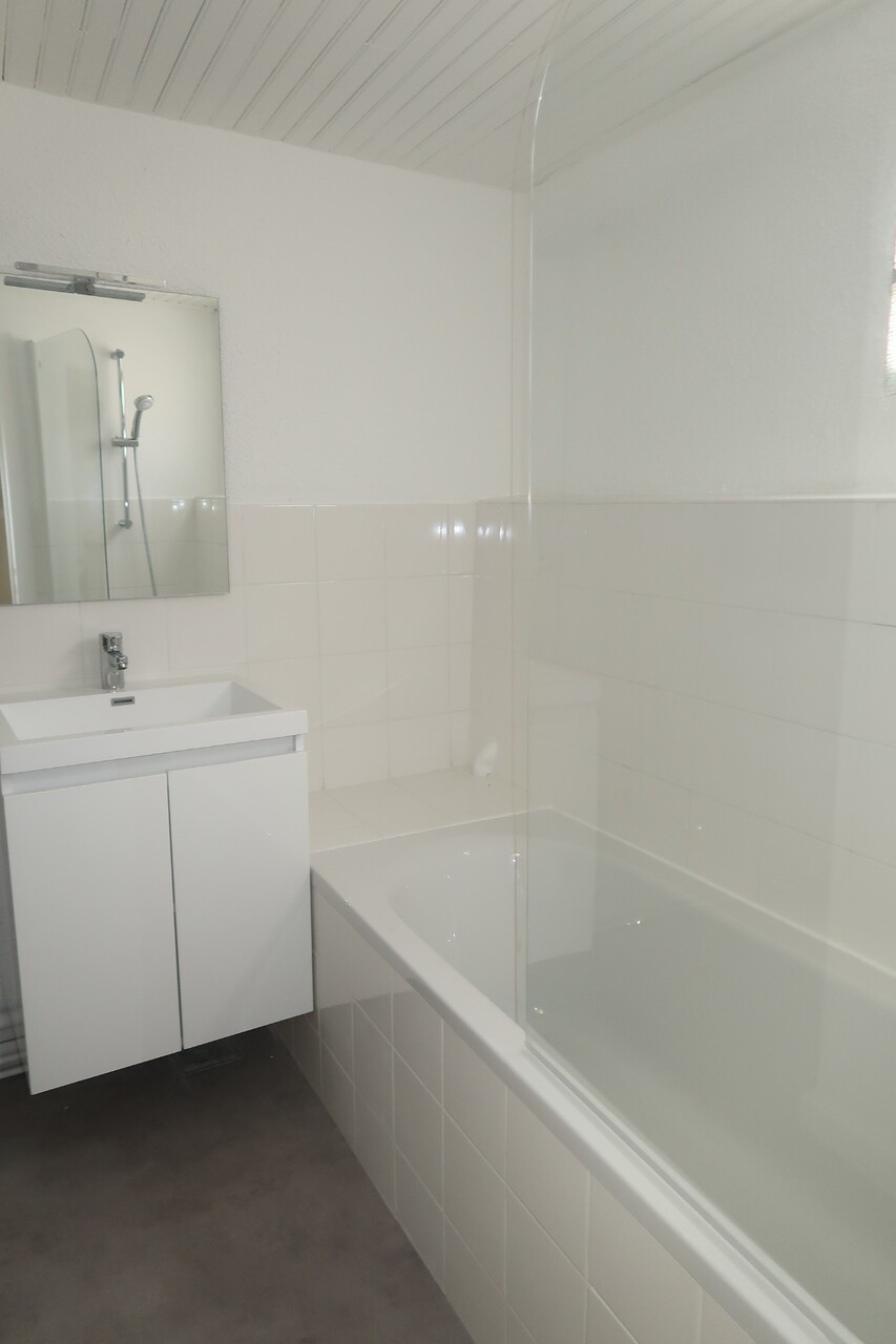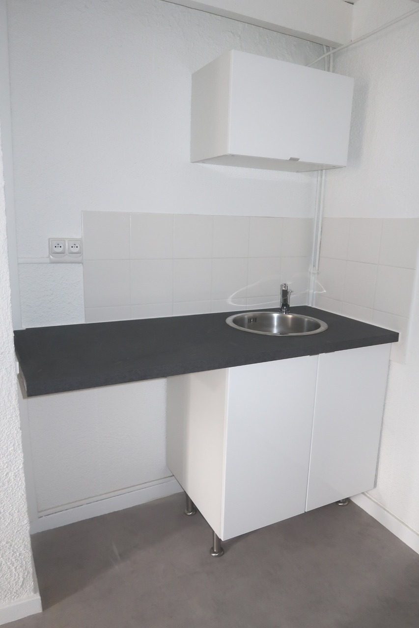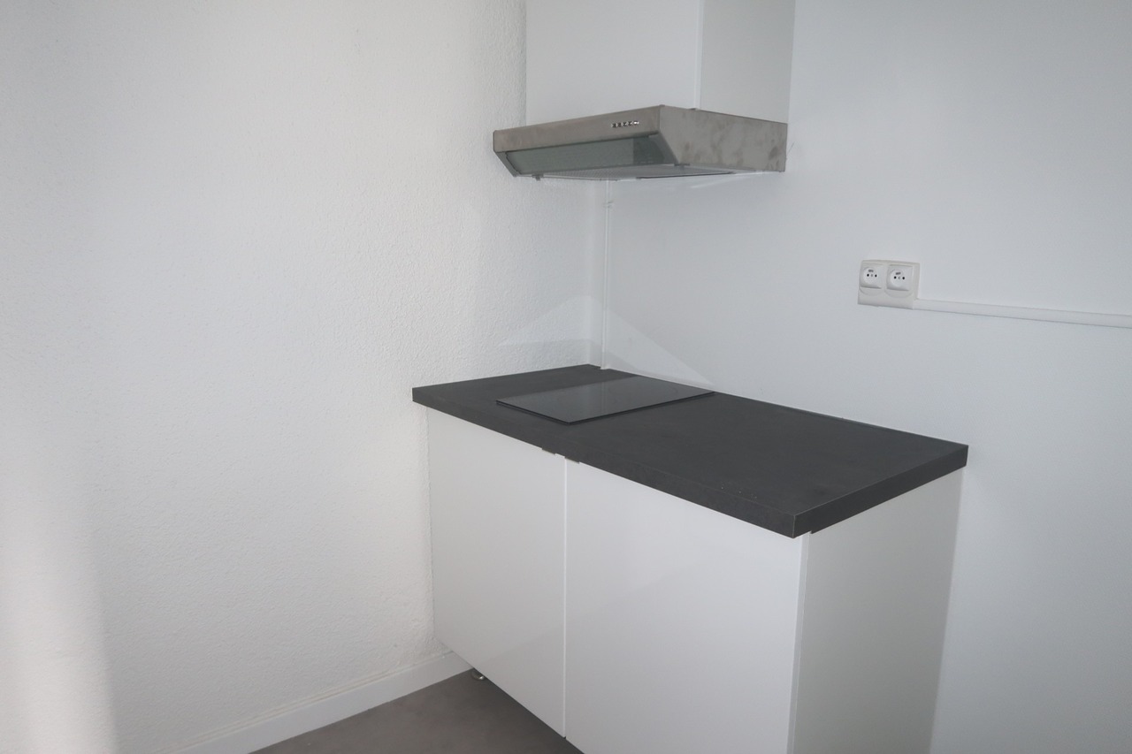 Cet appartement se compose d'une grande pièce de vie lumineuse, d'une cuisine neuve aménagée (meubles et plaques), d'un coin bureau, d'un espace nuit en mezzanine et d'une salle de bains avec wc et branchement machine à laver.