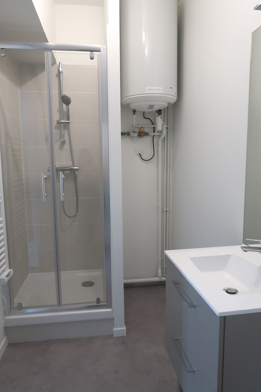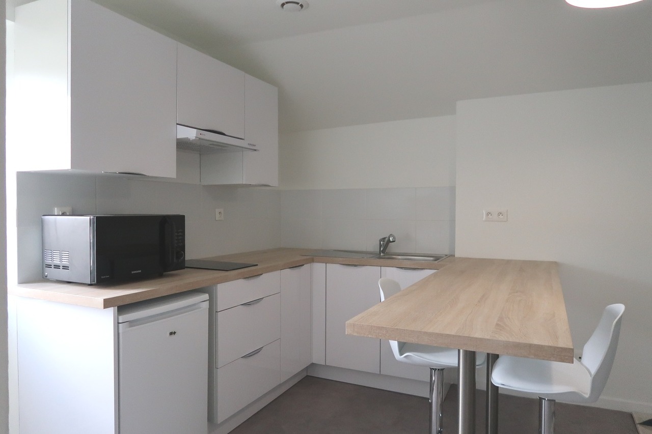 Cet appartement est composé d'une pièce de vie avec cuisine aménagée et équipée (plaque, vaisselle, micro-ondes, hotte, frigo) avec coin salon, d'une chambre et d'une salle d'eau avec WC.